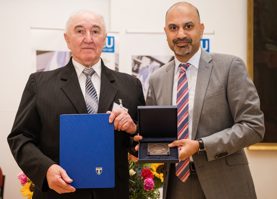 Prof. dr hab. Grzegorz Mlostoń odbiera Medal Justusa Liebiga z rąk prezydenta JLU prof. Joybrato Mukherjee.