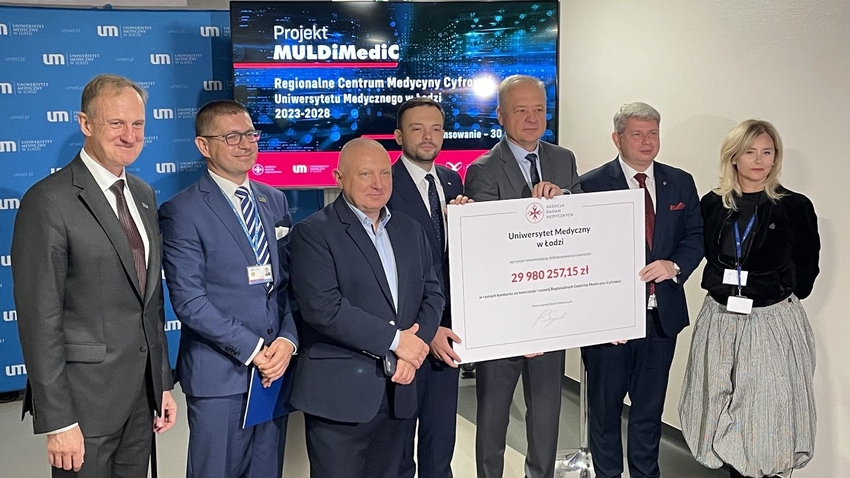 Symboliczne wręczenie czeku w Regionalnym Centrum Medycyny Cyfrowej UMED w Łodzi. Od lewej: prof. Janusz Piekarski (Prorektor UMED Łódź), Paweł Zawieja (Zastępca Kanclerza UMED Łódź), prof. Adam Antczak (Prorektor UMED Łódź), dr hab. Radosław Sierpiński (Prezes ABM), Prof. Radzisław Kordek (Rektor UMED Łódź), Jarosław Brózda (II Wicewojewoda Łódzki), dr Monika Domarecka (Dyrektor CSK)
