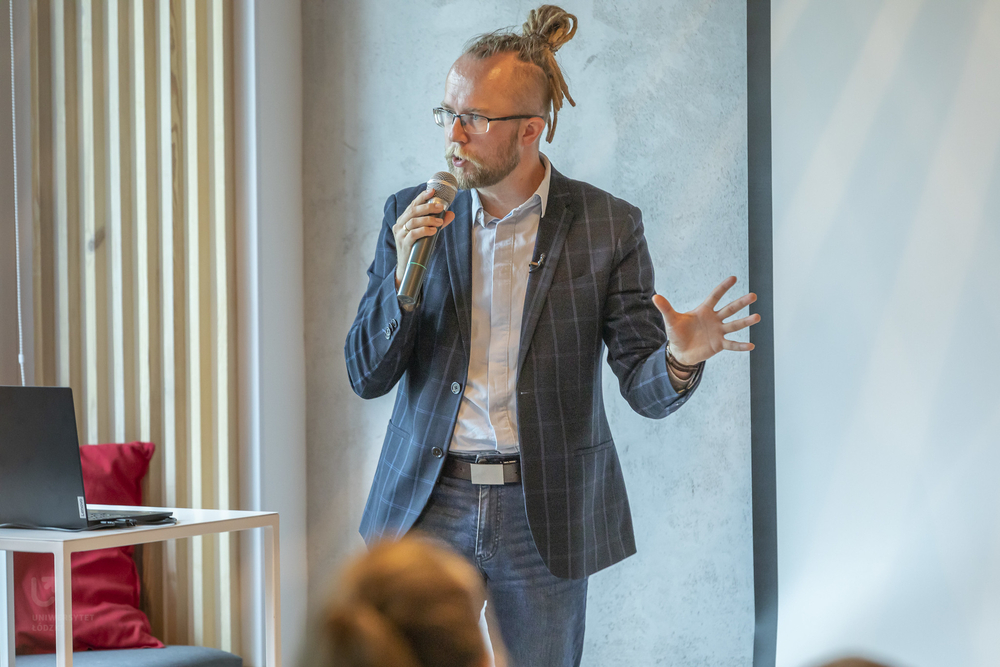 dr Łukasz Lamża podczas wygłaszania wykładu