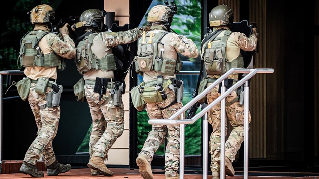 Scenariusz zakładał również porwanie zakładnika oraz zabunkrowanie się napastników w jednym z pokoi. Na miejsce zdarzenia przyjechał m.in. oddział kontrterrorystyczny, który po nieudanych negocjacjach dokonał szturmu na budynek w celu pojmania sprawców. Akcja zakończyła się uwolnieniem zakładników, a do budynku mogły wejść siły straży pożarnej, które sprawdziły teren. W akcji brał udział także robot, który bezpiecznie usunął podejrzany plecak z sali konferencyjnej.
