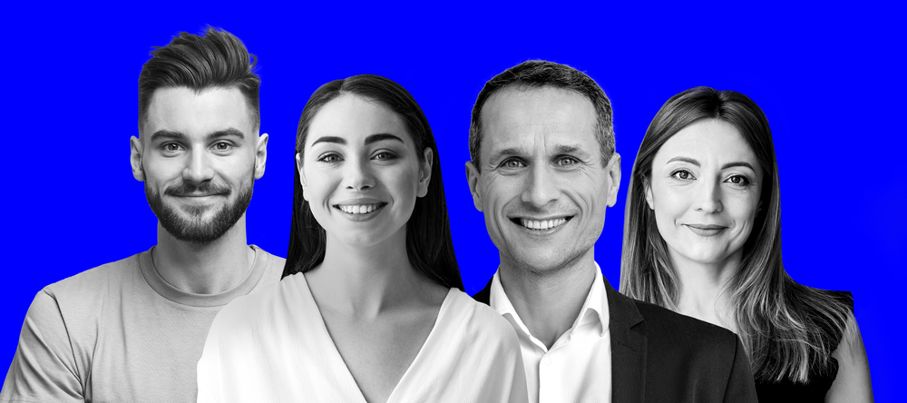 grafika dotycząca programu cztery uśmiechnięte osoby na niebieskim tle