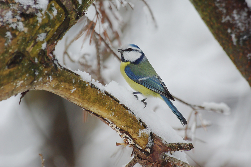 Modraszka, to jeden z gatunków sikor, które łatwo zaobserwować zimą w mieście.