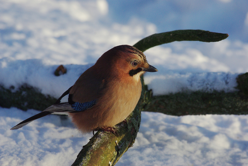 Sójka zwyczajna w zimowej scenerii.
