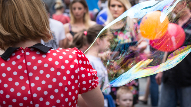 Kobieta w czerwonej sukience w białe groszki z bańkami mydlanymi, w tle widoczne inne osoby