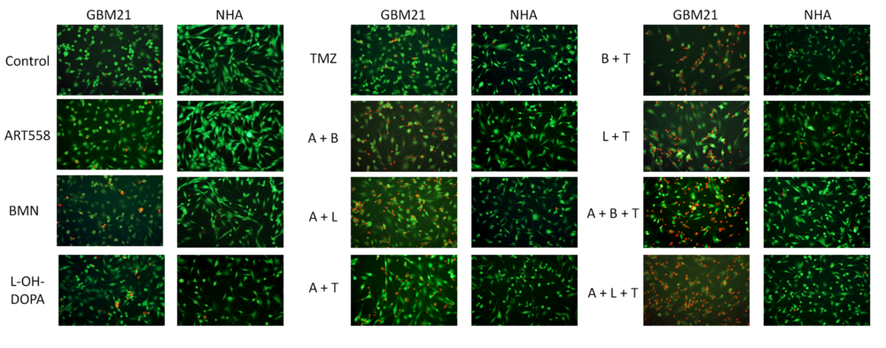 The effect of the DNA polymerase theta inhibitor (ART558), PARP inhibitor (BMN), RAD52 inhibitor (L-OH-DOPA), cytotoxic compound temozolomide (TMZ) and their combination on glioma cells (GBM21) and normal cells (NHA) observed under fluorescence microscope using double staining with Propidium Iodide and Calcein AM. Viable cells are stained in green and cells with impaired cell membrane integrity are stained in red