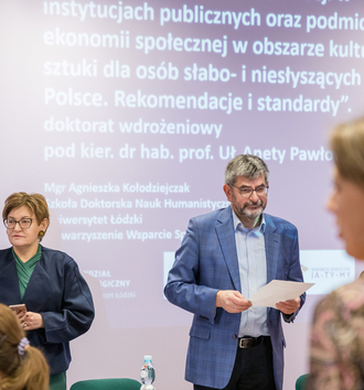 The subject of mgr Agnieszka Kołodziejczak's doctoral dissertation is included in the title: "Problem dostępności informacji w instytucjach publicznych oraz podmiotach ekonomii społecznej w obszarze kultury i sztuki dla osób słabo- i niesłyszących w Polsce. Rekomendacje i standardy". The researcher set herself the goal of analysing and verifying the methods which are currently used in the practice of socio-cultural life in Poland that support the accessibility and perception of the content of culture and art.