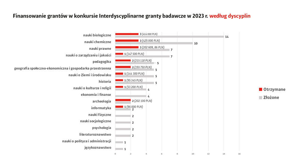 Interdisciplinary Research Grants 2023There was a great interest in the competition. Eighty applications, amounting to PLN 9 244 213.68, were submitted. The competition's budget made it possible to finance 20 projects for a total of PLN 2,178,921.86
