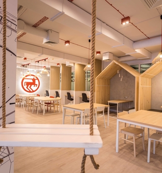 IDI Studio company has decided to go for a warm, Scandinavian design. Bright wood and white are the dominant accents. Such colours combined with a large number of lamps and green elements, such as a wall with moss as well as plants in the pots make it easier to concentrate, silence one's body and mind after a hard day of learning.