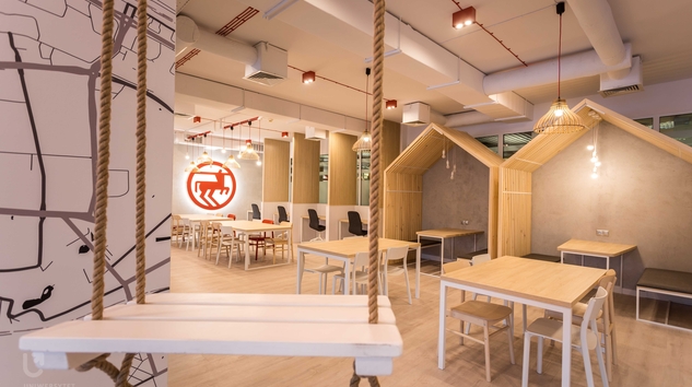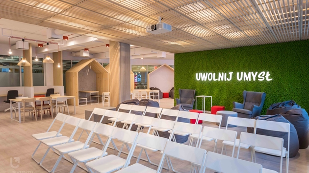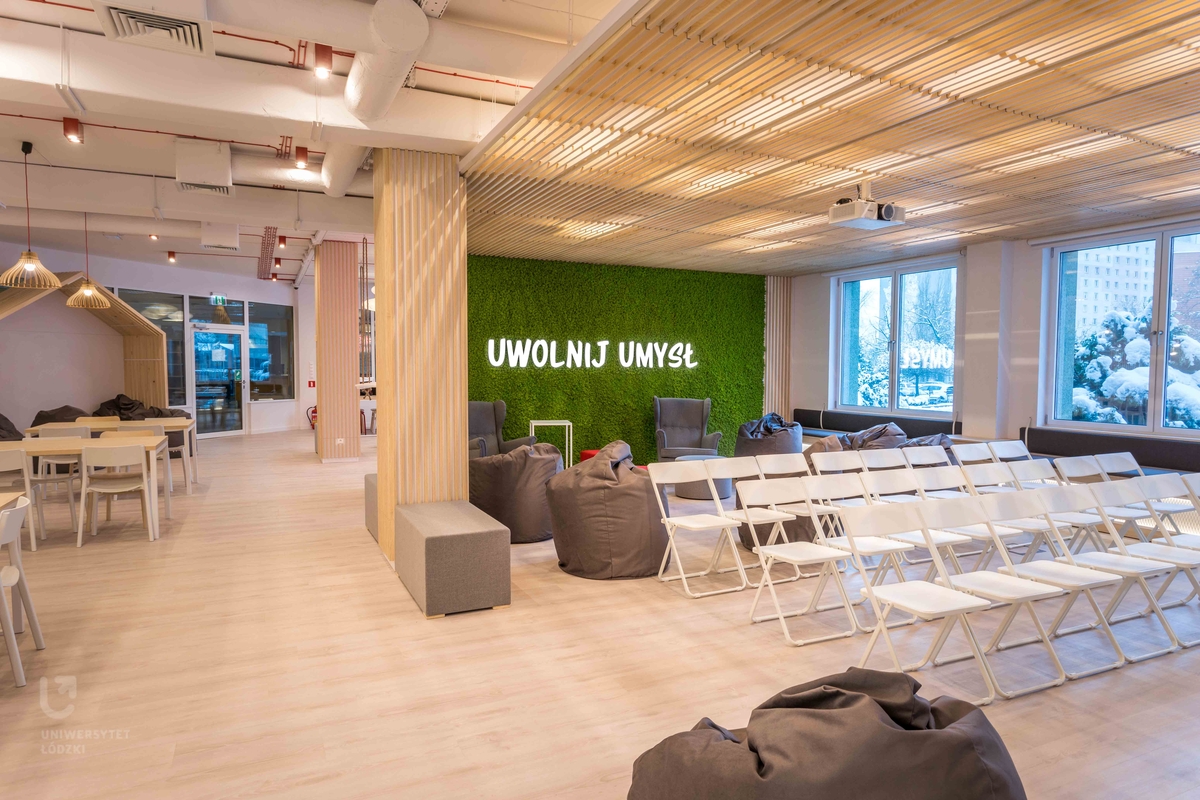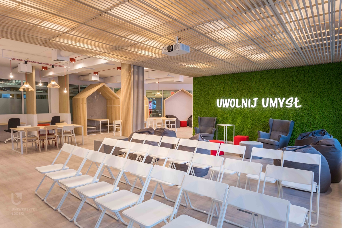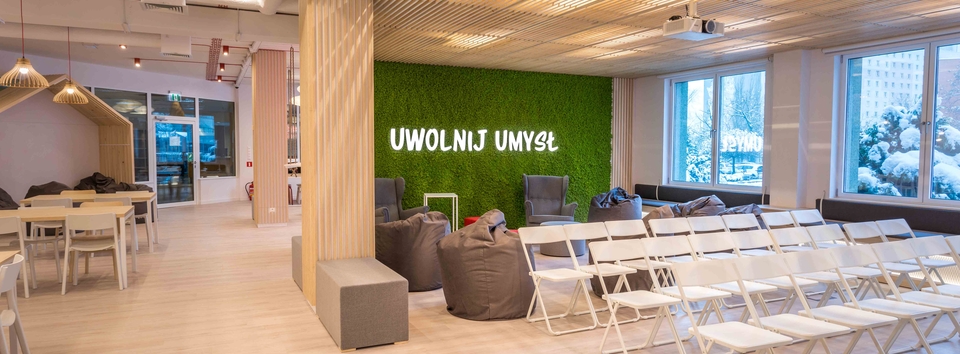 Lecture zone is one of them. It is equipped with a screen, projector and comfy chairs. It is a perfect place to meet interesting people and take part in inspiring lectures and trainings. The zone will be used by both, the UL students as well as employees of Rossmann from all over the country. "Free your mind" slogan placed on a moss-covered, stunningly green wall, encourages intellectual gymnastics, going beyond the established schemes and following new paths.