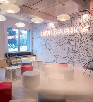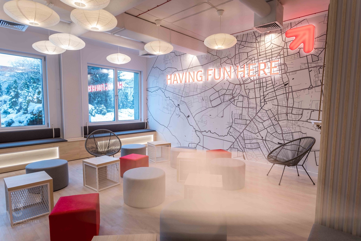 In the Rossmann Zone you can also simply take a rest and stop studying for a few moments. In the relaxation zone, an enormous map of Lodz stands out. There are bigger tables so that you can chat or play board games in bigger groups. Soft pouffes and seats on which you can take a breath after a class are placed all around. And if you feel hungry - it is also not a problem. You can eat there - two vending machines with snacks and drinks will be available.