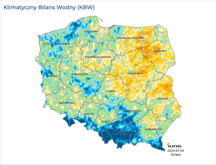 Klimatyczny Bilansu Wodny (KBW) dla kraju w okresie od 1 maja do 30 czerwca 2024 roku. Średnia wartość KBW wynosiła -121 mm. Na południu kraju deficyt wody był najmniejszy. Największe niedobory wody od -160 do -229 mm notowano na obszarze: Pojezierza Mazurskiego, Polesia, Wyżyny Lubelskiej, Niziny Mazowieckiej oraz Podlaskiej. Stwierdzono wystąpienie suszy rolniczej powodujące straty o 20% wyższe w stosunku do plonów uzyskanych w przeciętnych wieloletnich warunkach pogodowych (źródło: SMSR - Mapy KBW 2024-05-01 - 2024-06-30 (iung.pulawy.pl).