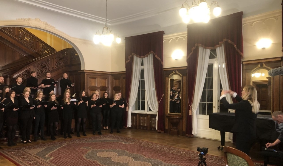 występ chóru z dyrygentem w stylowych wnętrzachChór Akademicki UŁ wykonuje hymn Ukrainy. Nagranie zostało opublikowne na stronie internetowej uczelni w pierwszych dniach agresji rosyjskiej dla dodania otuchy naszym gościom z Ukrainy.