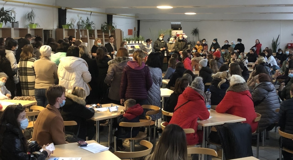 tłum ludzi w kurtkach w sali stołówkiSpotkanie informacyjne z przedstawicielami uczelni dla obywateli Ukrainy, którym UŁ udzielił gościny w domach studenckich na osiedlu akademickim.