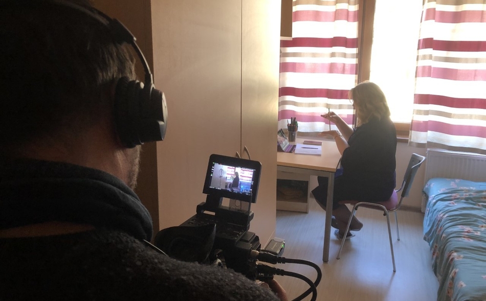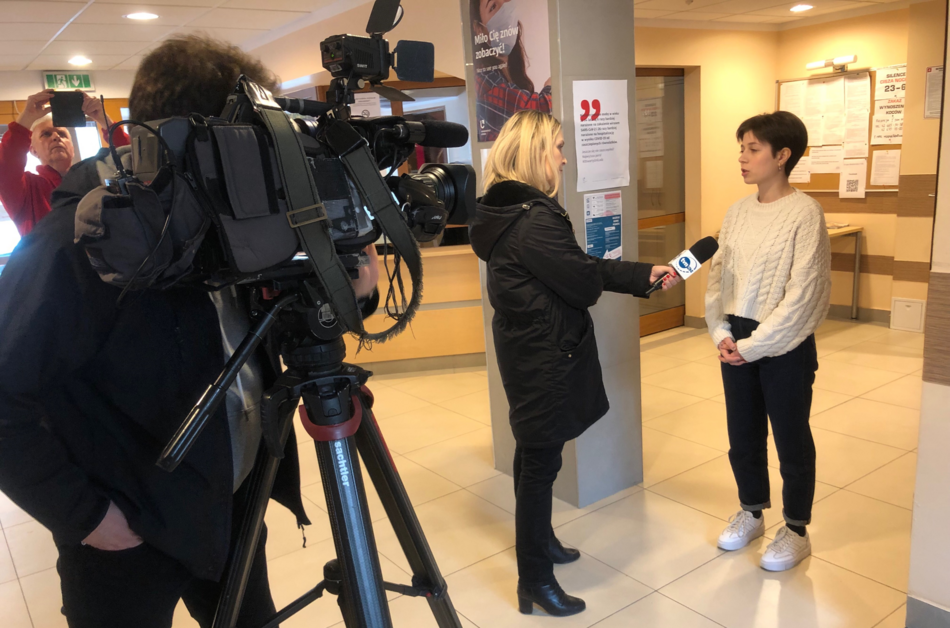 ekipa telewizyjna z kamerą rozmawia z młodą kobietąOpiekę nad przybyszami z Ukrainy na osiedlu akademickim sprawowali wolontariusze Akademickiego Centrum Wsparcia UŁ – ukraińscy i polscy studenci. Na zdjęciu – wywiadu udziela jedna z ukraińskich wolontariuszek, która zgłosiła się do opieki nad dziećmi.
