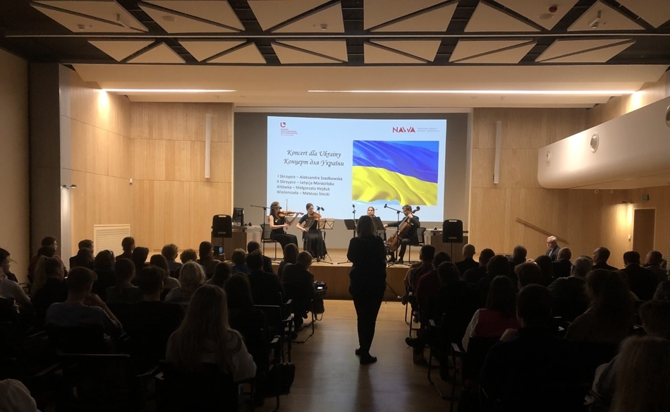 sala koncertowa wypełniona publicznością i kwartet smyczkowy na scenieCharytatywny koncert karnawałowy zorganizowany przez Studium Języka Polskiego dla Cudzoziemców UŁ. Cały dochód z niego został przeznaczony na pomoc walczącej Ukrainie.