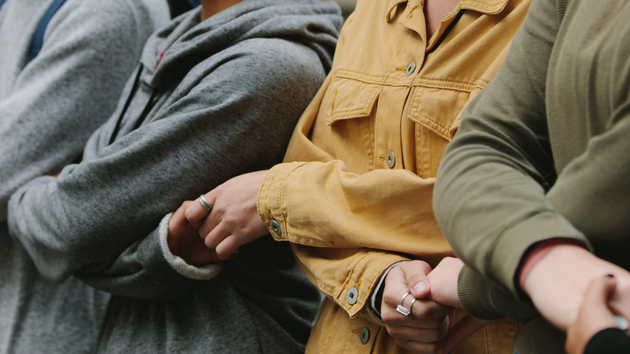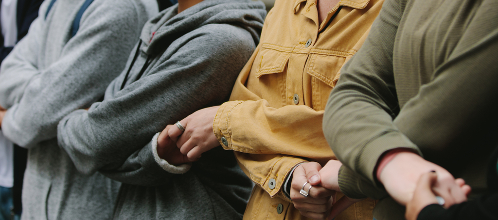 Osoby stojące obok siebie w rzędzie i trzymające się za ręce